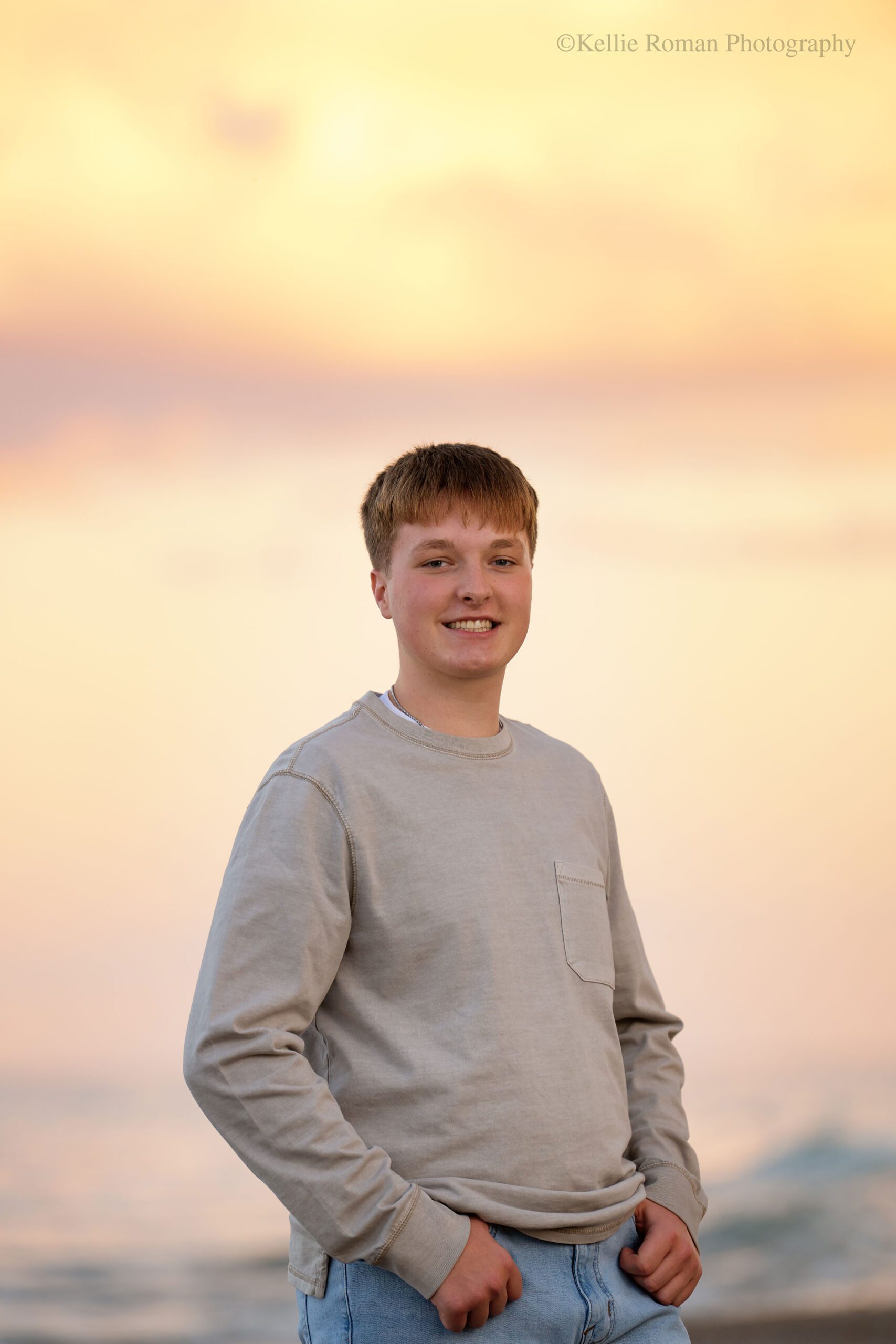 Our original date for Noah’s senior portraits was so gloomy outside! It had rained the entire day, and was incredibly dark out. Although the forecast was looking to clear out by sunset, Noah’s Mom was concerned with the looks of the gloomy skies so to play it safe we decided to reschedule. Wow, did we hit the jackpot with this amazing evening. You’d never even know this was the shoreline of Lake Michigan in Racine County. It looks like a beach in a tropical location with those beautiful pastel skies and all that gorgeous gold sunlight! Exactly what we were hoping for, with this Muskego High School Senior!